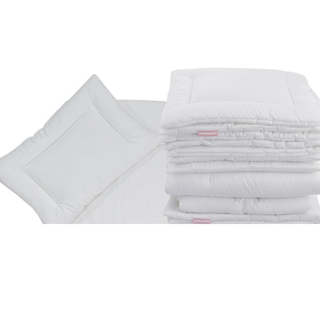 Płaska poduszka i lekka kołderka wykonane są z delikatnej w dotyku i bardzo trwałej dzianiny bawełnianej. Kołdra i poduszka są pikowane, tak by podczas prania w pralce oraz wirowania nawet na najwyższych obrotach, wypełniacz pościeli nie grupował się i nie przesuwał.