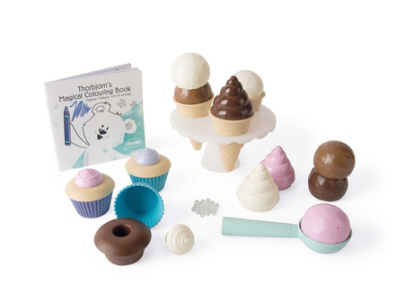 Śliczny zestaw deserowy Thorbjorn zawiera rożki do lodów, gałki do lodów, ciastka i inne pyszne akcesoria do domowych deserów. Dzięki wielu możliwym kombinacjom, na dołączonym stojaku/paterze można atrakcyjnie podawać i pięknie układać wiele różnych rodzajów lodów i ciast. Ten zestaw deserowy nadaje się zarówno do wnętrz, jak i na zewnątrz, na przykład do zabawy w piasku. Do zestawu dołączona jest również piękna kolorowanka, w której miś Thorbjorn i jego przyjaciele z miasteczka Frostby mogą pokolorować swój magiczny świat. Zestaw deserowy z lodami jest zapakowany w elegancki kartonik, zawiera wszystko co potrzeba,aby wyprawić przyjęcie plus lodowy kryształ! W zestawie znajduje się książeczka kolorowanka o misiu Thorbjorn i zagubionym krysztale lodu. Można bawić się w lodziarnię, cukiernię - pomysłów jest wiele! Zabawki Thorbjorn pobudzają drobne umiejętności motoryczne, zmysł równowagi i wyobraźnię dziecka.