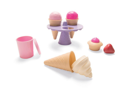 Zestaw lodowy zapakowany jest w elegancki kartonik, zawiera 3 wafelki,kubeczek, różne kulki lodów i rożki, które można łączyć na wiele różnych sposobów. Lody są atrakcyjnie podane na specjalnym stojaku,wszystko w kolorach pastelowego różu, lawendy i fuksji. Dzięki wielu kombinacjom można serwować wiele smaków lodów i przugotować piękne przyjęcie dla lalek i misiów lub bawić się w lodziarnię lub sklep. Idealny również do zabawy w ogrodzie z lemoniadą i ciasteczkami.