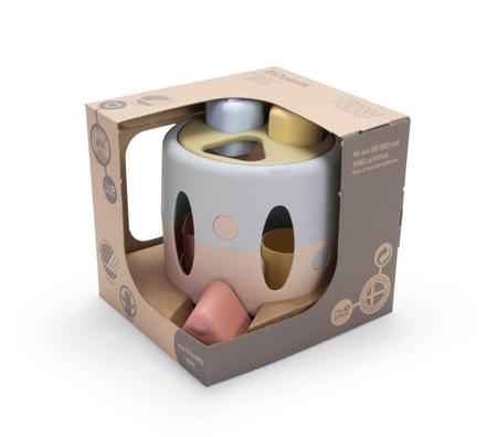 Sorter kształtów pobudza zdolności motoryczne dziecka i uczy koncentracji i koordynacji ręka-oko. Każde dziecko uwielbia wkładać i wykładać przedmioty, aby zrozumieć ich kształty i właściwości. Małe klocki w kształcie figur geometrycznych (kwadrat, koło, trójkąt) należy umieścić we właściwych otworach tak, aby wpadły do sortera. Taka zabawa to wyzwanie, które budzi kreatywność dziecka. Sorter jest produkowany w Danii z bioplastiku wykonanego z trzciny cukrowej, która w 100% jest zrównoważonym surowcem. To sprawia, że posiada certyfikat Nordic SwanEcolabel. Produkty te są przyjazne dla środowiska i nie zawierają szkodliwych chemikaliów. Opakowania wykonane są z tektury z recyklingu.