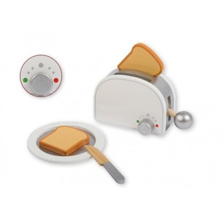 Drewniany toster do zabawy przyda się podczas przygotowywania smacznego śniadania. Pokrętła i mechanizm tostera urealni dziecięcą zabawę. Toster zawiera dwie kromki chleba, nóż i talerz.