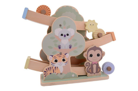 Piękna pastelowa rampa zjazdowa w kształcie leśnego drzewa ze zwierzakami z kolekcji The Wildies Family to zabawka, która gwarantuje wiele godzin kreatywnej zabawy. Rampa przypomina drzewo, a panda, małpka, tygrysek i słonik zapraszają, a toczyć koło z góry w dół. Wystarczy postawić drewniane koło/walec na górze toru i rozpocząć wyścig. Koło zjedzie szybko na sam dół pokonując kolejne przeszkody.