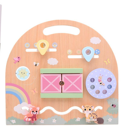 Drewniana aktywna tablica manipulacyjna to idealna zabawka dla malucha już od 12-tego miesiąca życia. Piękna tablica ze ruchomymi zwierzątkami, otwieranym okienkiem, ruchomą tarczą zegara i innymi uroczymi elementami pozwoli dziecku rozwijać umiejętności psychomotoryczne. Ta tablica sensoryczna pozytywnie wpływa na rozwój zmysłów oraz umożliwia ćwiczenie koordynacji rączek (mała motoryka). Dziecko podczas zabawy poznaje nowe kształty i kolory, wzbudza zainteresowanie, pobudza kreatywność oraz dziecięcą chęć uczenia się, a także pozytywnie wpływa na rozwój dziecka.