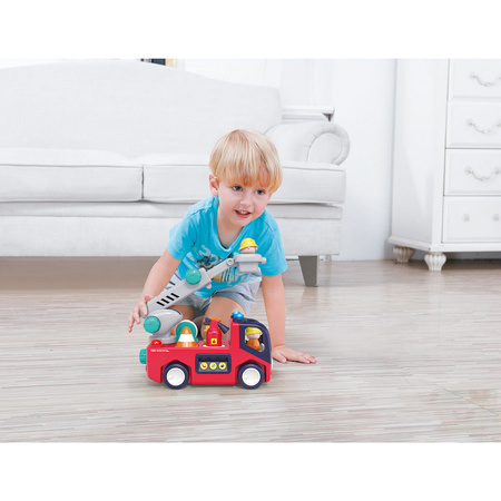 WÓZ STRAŻACKI Z MUZYKĄ I ŚWIATŁEM 6944167100446 Wóz strażacki z Muzyką i Światłem marki Hola to interaktywna i edukacyjna zabawka, która dostarcza wiele radości, jednocześnie wspierając rozwój dziecka. SAMOCHÓD jest zaprojektowany z dbałością o szczegóły, przypominając prawdziwy pojazd ratunkowy. Ma charakterystyczne oznaczenia i kolory, które natychmiast kojarzą się z wozem strażackim. Zabawka jest wyposażona w efekty świetlne oraz dźwiękowe, które naśladują prawdziwe syreny ratunkowe. Po naciśnięciu odpowiedniego przycisku,wóz emituje realistyczne dźwięki syreny i migające światła, co dodaje autentyczności zabawie i stymuluje zmysły dziecka. samochód posiada różne przyciski, które aktywują dźwięki, muzykę oraz światła. Te interaktywne elementy zachęcają do aktywnej zabawy, rozwijając zdolności poznawcze oraz koordynację ruchową malucha. Zabawka jest wykonana z wytrzymałego, nietoksycznego plastiku, który jest bezpieczny dla dzieci. Wszystkie elementy są starannie zaokrąglone, co zapewnia bezpieczeństwo podczas zabawy. Zabawka jest na tyle kompaktowa, że można ją łatwo zabrać ze sobą w podróż. Jest również lekka, co umożliwia maluchom swobodne przenoszenie jej i manipulowanie nią. wóz strażacki z Muzyką i Światłem marki Hola to świetna zabawka, która dostarcza nie tylko zabawy, ale także edukuje, wprowadzając maluchy w świat ratownictwa medycznego. Dzięki interaktywnym funkcjom, dziecko może bawić się, jednocześnie ucząc się nowych dźwięków i rozwijając swoje umiejętności manualne.