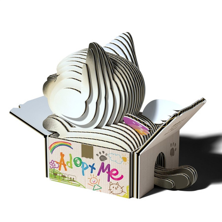 - realistyczne detale: „pomazane” pudełko, duże kocie oczy, mleczne futerko, brązowe uszka i pyszczek.