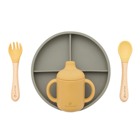 Zestaw zawiera talerz z przyssawką, kubek z ustnikiem, łyżkę i widelec z drewna bukowego i silikonu.