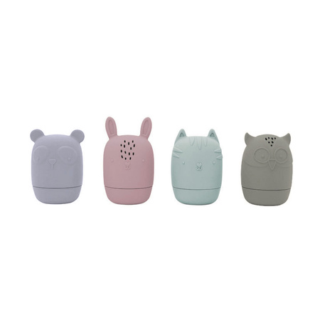 Zestaw 4 uroczych zwierzątek- panda, króliczek, kotek, sówka- zamienionych w zabawki do kąpieli. Można je łatwo otworzyć, co ułatwia ich suszenie i czyszczenie, dzięki czemu w środku nie rozwija się pleśń. Miękkie i przyjemne dla małych rączek.