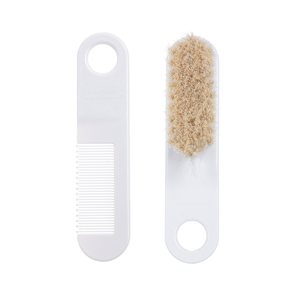 Szczotka do włosów z naturalnego, miękkiego włosia w zestawie z grzebykiem do codziennej pielęgnacji włosów dziecka. Grzebień posiada zaokrąglone ząbki, które nie podrażniają wrażliwej skóry malucha. Szczotka delikatnie masuje główkę dziecka, nie elektryzując włosów. Idealna od pierwszych dni po urodzeniu.