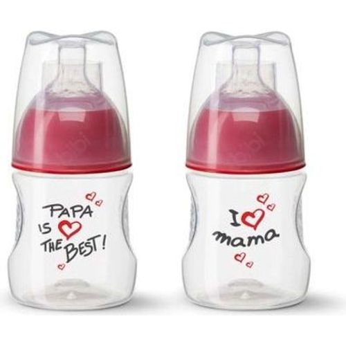 Butelka antykolkowa Papa/Mama Classic od Bibi o pojemności 120 ml powstała z myślą o najmłodszych. Śliczna butelka z motywem dla ulubieńców tatusia i mamusi ma odpowietrznik antykolkowy, który redukuje kolkę u maluszka. Dzięki czemu, dziecko może w pełni czerpać korzyść ze spożywania pokarmu, oraz nie cierpi z powodu kolek. Butelka ma ergonomiczny kształt, który z łatwością dopasowuje się do małych rączek. Butelkę bardzo łatwo się montuje i demontuje. Jest dostosowana do użytku kuchence mikrofalowej, zmywarce oraz w sterylizatorze parowym. Butelka wykonana z trwałego i bezpiecznego plastiku.