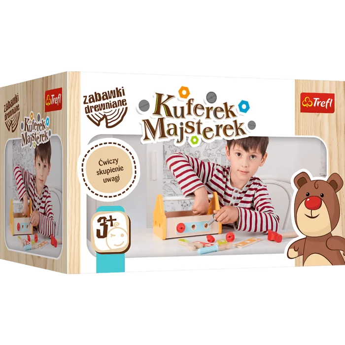 Kuferek Majsterek to zestaw narzędzi dla każdego małego majsterkowicza. W skład zestawu wchodzą: młotek, klucz płaski, dłuto, śrubki, podkładki, skrzynka. Zestaw wykonany z jasnego, naturalnego drewna. Wszystkie materiały wykorzystane do stworzenia zabawki posiadają atesty, a także zostały pomalowane nietoksycznymi farbami.