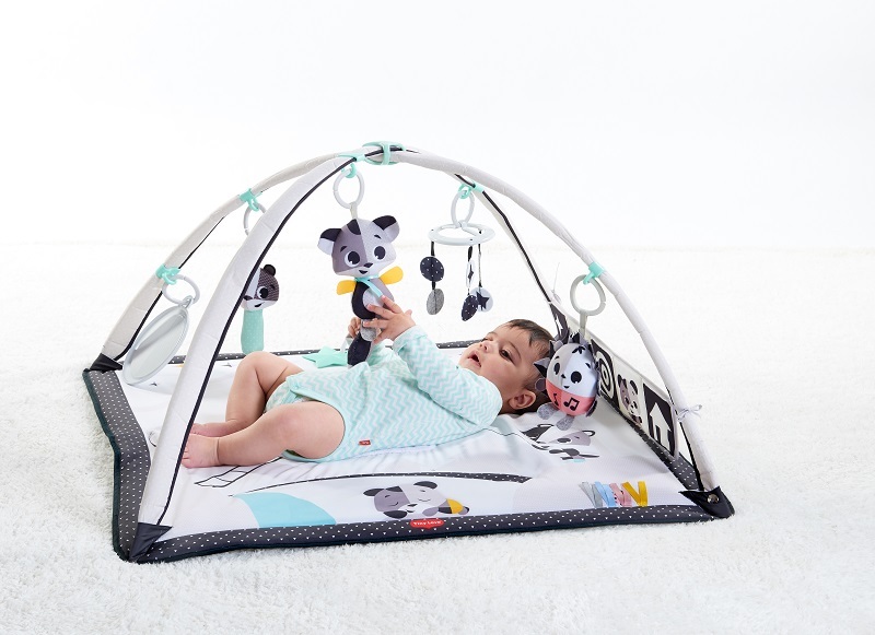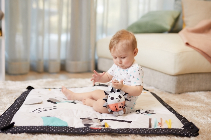 - Ruchy całego ciała - duży obszar do zabawy pozwala dziecku na rozciąganie swojego ciała, eksperymentowanie z ruchem oraz turlaniem się podczas gdy czarno-biała książeczka i inne elementy pomagają wydłużyć czas na brzuszku.