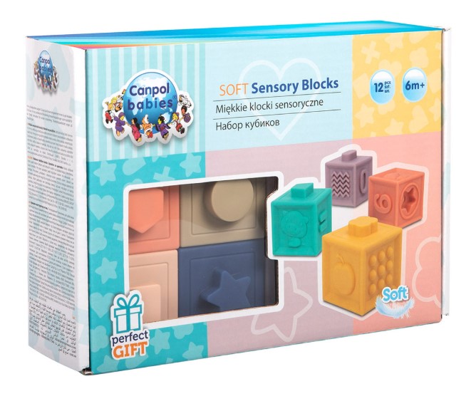 Canpol miękkie klocki sensoryczne to zestaw 12 różnokolorowych klocków, które posiadają wytłoczone na swoich ściankach kształty, symbole i zwierzątka. Klocki można łączyć ze sobą, a nawet gryźć, ponieważ są przeznaczone dla dzieci od 6 miesiąca życia. Gdy dziecko ściśnie klocek, ten zapiszczy ku uciesze maluszka.