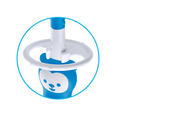 Osłonka przy szczoteczce zabezpiecza przed nieprawidłowym włożeniem szczoteczki do buzi dziecka.