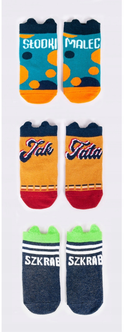 Niemowlęce skarpety dla chłopców, dostępne w praktycznym 3-paku. W typowo chłopięcych wzorach i kolorach, pasujących do wielu stylizacji. Uroku dodają im malutkie uszka. Dodatkowo ozdobione są napisami w języku polskim. Skarpety są miłe w dotyku, dobrze układają się na stopie.