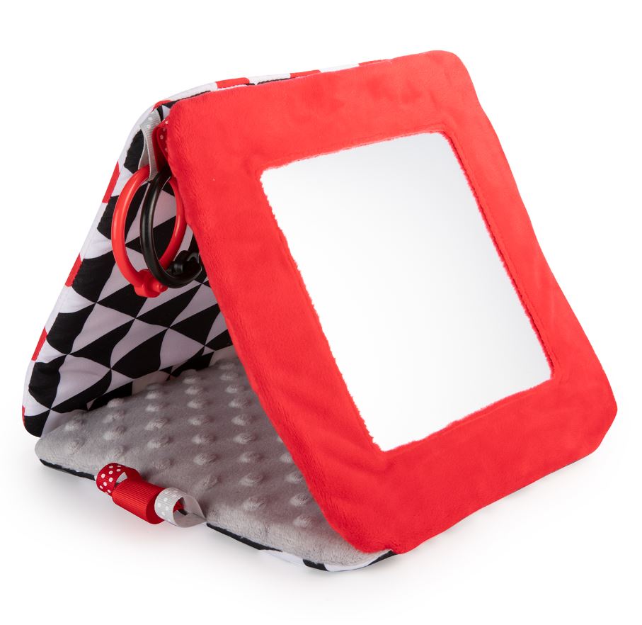 Miękka i szeleszcząca zabawka sensoryczna już na początku przypadnie do gustu niemowlakowi, ze względu na kontrastowe odcienie czerni, bieli i czerwieni, które dziecko zaczyna rozróżniać jako pierwsze. Duże lusterko kontrastowe Sensory Toys Canpol Babies można postawić przed leżącym na brzuszku maluszkiem, żeby zachęcić szkraba do wzmacniania mięśni i podnoszenia główki. Można je również zawiesić na szczebelkach łóżeczka lub przyczepić do maty za pomocą specjalnych zaczepów z magnesem. Różne struktury kolory i wydawane dźwięki z pewnością zainteresują maluszka i będą stymulowały umiejętności zmysłowe i motoryczne i manualne.
