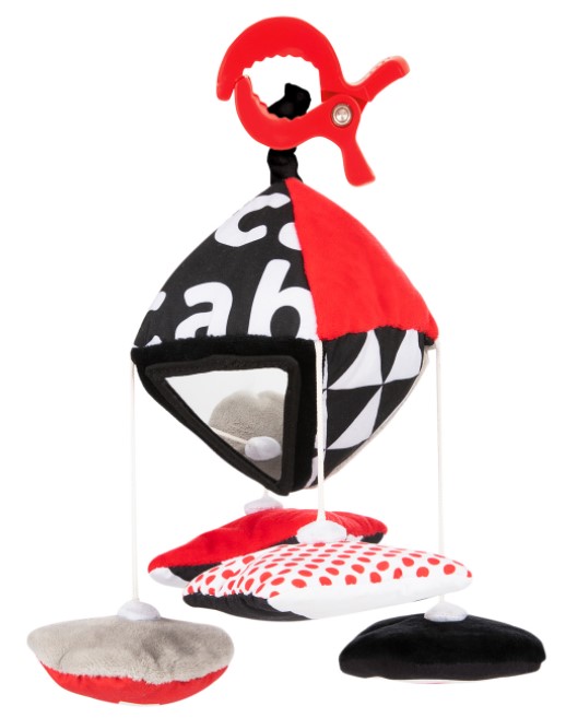 Kontrastowe kolory; czerwony, czarny oraz biały przyciągają i pobudzają wzrok szkraba. Dodatkową atrakcją dla małych oczek są dwa bezpieczne lusterka.
