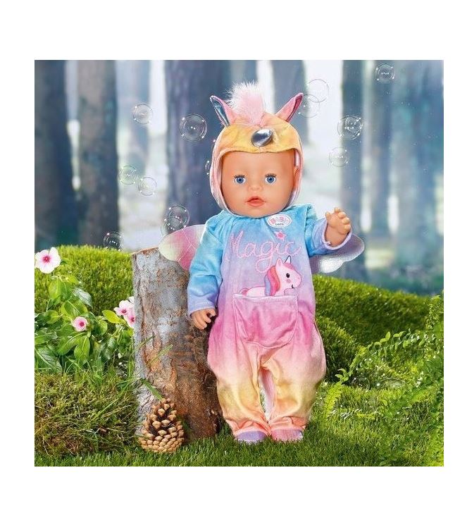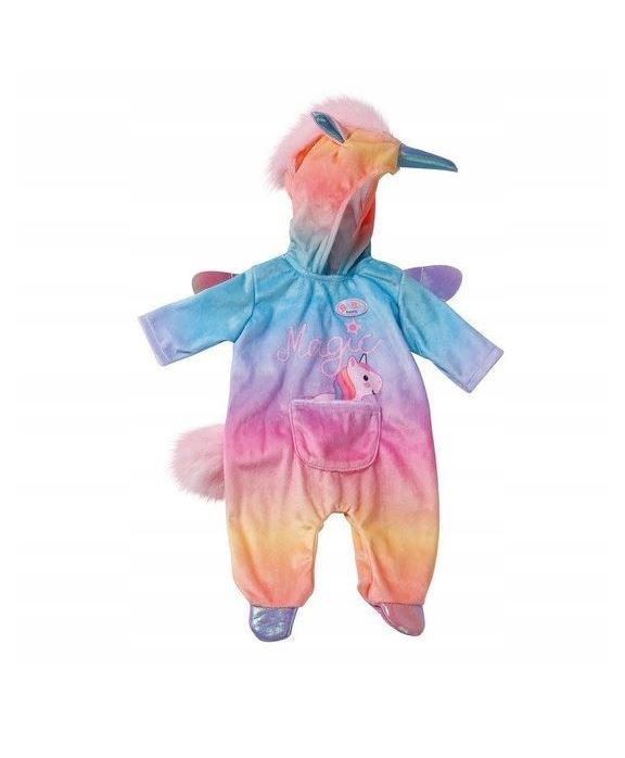 Strój jest wielokolorowy a na brzuszku ma wesołego jednorożca i kieszonkę.