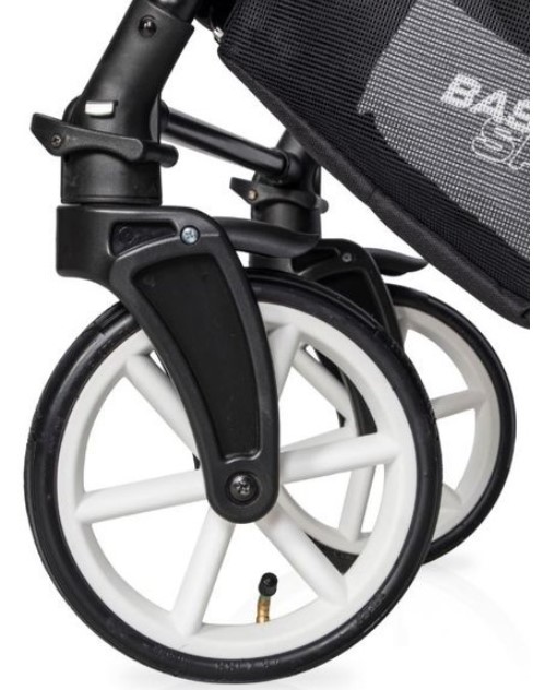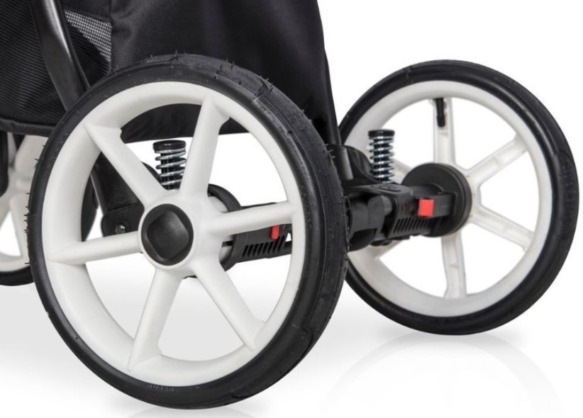 Przednie koła są skrętne z możliwością blokady na wprost. Oznacza to, że Riko Basic Sport jest zwinny i łatwo nim manewrować. Pompowane koła wózka osadzone są na łożyskach, dzięki czemu kręcą się gładko i płynnie.