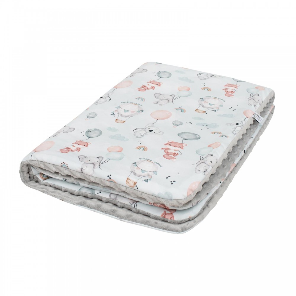 Kocyk wykonany jest z wysokogatunkowej bawełny 100%, którą z drugiej strony uzupełnia mięciutki plusz minky. Środek kocyka wypełniony jest antyalergiczną włókniną wysokopuszystą silikonową. Zapewnia ona dziecku ciepło oraz wygodę podczas użytkowania.