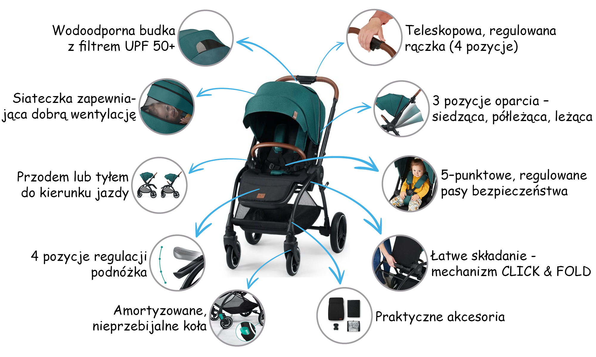 Jako rodzic zapewne nie raz już pomyślałas/łeś, że dwie ręce to stanowczo zbyt mało. Wiedząc o tym, twórcy wózka Kinderkraft Evolution wyposażyli go w system Click&Fold, który pozwoli ci złożyć spacerówkę za pomocą tylko jednej ręki. Po złożeniu, również jedną ręką, możesz wózek podnieść i schować czy spakować do bagażnika. Dzięki blokadzie samoczynnego rozłożenia zachowa swoją kompaktową formę. To co? Może Kinderkraft Evolution?