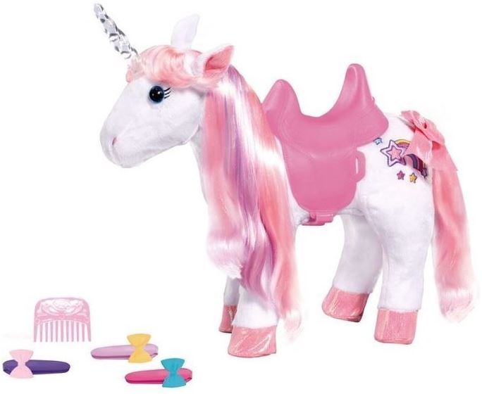 Poznaj wyjątkowego jednorożca od Baby Born! Różowy kucyk ma niezwykłe moce, świeci! Po naciśnięciu lewego ucha jednorożca, jego kopytka zaczynają świecić! A, to nie wszystko.... Róg jednorożca również świeci, mieni się wieloma kolorami! Jednorożec wydaje odgłosy, takie jak rżenie oraz przyjemne dla ucha melodie. Dołączone akcesoria wzbogacają zabawę. Różowe siodło na grzbiecie konika można łatwo zdjąć lub posadzić na nim lalkę! Dołączonym grzebykiem możesz czesać i pielęgnować kolorowe, długie włosy jednorożca.