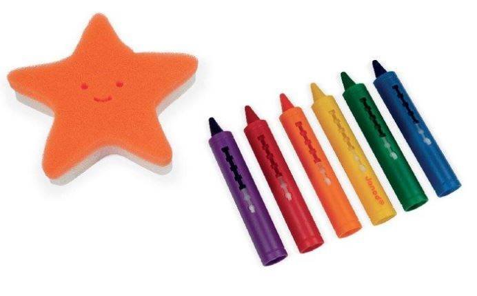 Kredki do kąpieli francuskiej marki JANOD to 6 kolorowych sztyftów (żółty, pomarańczowy, czerwony, fioletowy, niebieski i zielony) w osłonkach z tworzywa. Nadają się do malowania po śliskich powierzchniach, np. wannie czy kafelkach. Łatwo się zmywają. Do zestawu dołączona jest urocza gąbka w kształcie uśmiechniętej rozgwiazdy. Rysowanie to doskonały sposób na wyciszenie i idealny umilacz czasu, spędzanego w wannie. Zabawkę zaprojektowano we Francji. Zapakowane jest w estetyczne pudełko z uchwytem. Idealnie nadaje się na prezent.