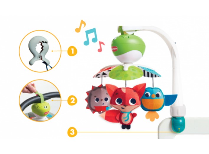 Urocza zabawka, która daje dziecku poczucie bliskości i komfortu, gdy jesteś w podróży. Jej kojące melodie i wolne tempo poruszania się zawieszek pomagają dziecku zrelaksować się i zachęcają do rozwoju emocjonalnego i społecznego.