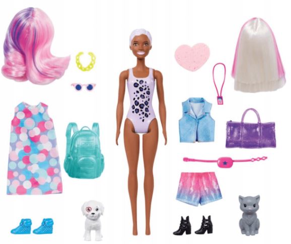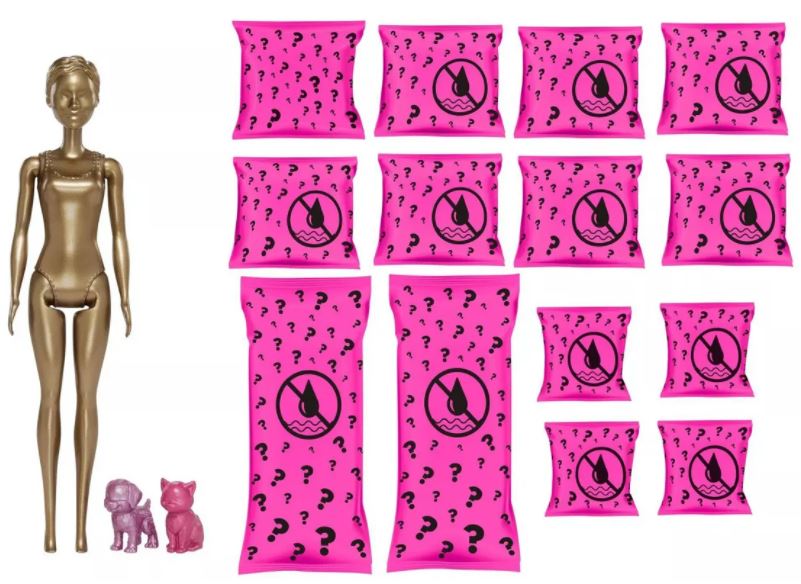 Barbie kolorowa niespodzianka to wyjątkowa lalka! Dlaczego wyjątkowa? Do końca nie wiesz, jak ona wygląda. Jest to po prostu niespodzianka! Otwieranie opakowania jest częścią zabawy – pociągnij za pasek, aby usunąć zewnętrzną warstwę i odsłonić przezroczystą tubkę. W środku znajduje się lalka o metalicznie złotym kolorze, która ma funkcję zmiany koloru.