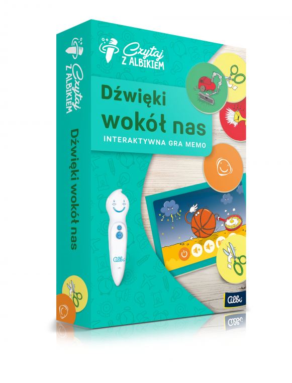 Oto znana wszystkim gra Memo w całkiem nowej odsłonie. "Albi Memo. Dźwięki Wokół Nas" ćwiczy nie tylko pamięć wzrokową, ale także słuchową. Na żetonach do gry są zakodowane różne dźwięki z naszego otoczenia. Zadaniem gracza jest odnalezienie jak największej ilości par. Memo Dźwięki wokół nas zawiera aż trzy warianty gry, które można dopasować do wieku i poziomu zaawansowania gracza. Warianty gry z dźwiękami wymagają użycia mówiącego pióra Albik.