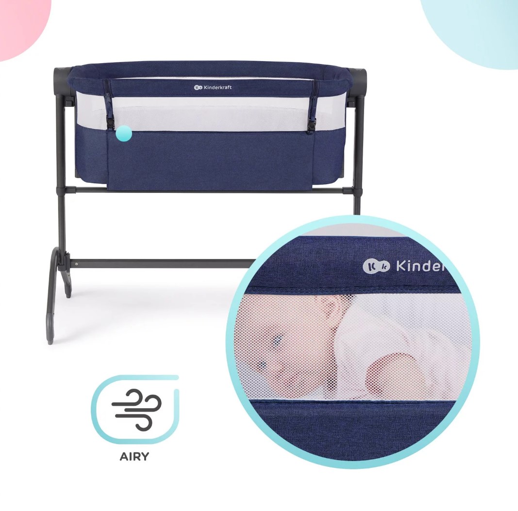 Siateczka na jednym boku łóżeczka zapewnia odpowiedni przepływ powietrza. Pozwoli Ci także na dyskretne zerkanie, co w danej chwili porabia Twoje dziecko.