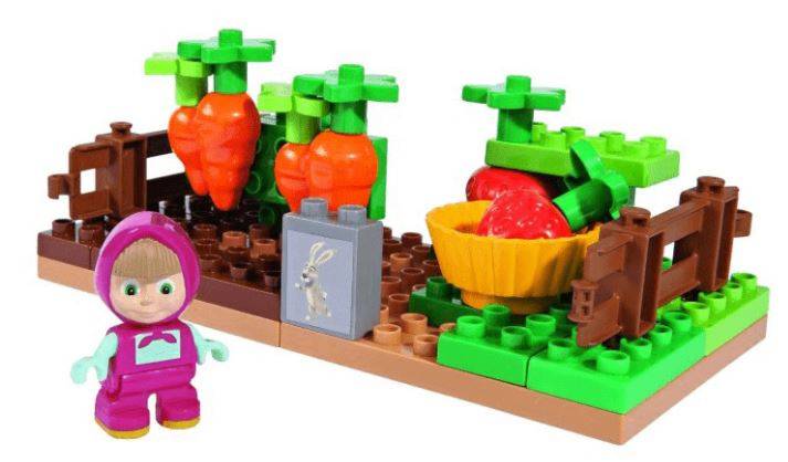 Masza i Niedźwiedź to najlepsi przyjaciele, którzy kochają wspólne przygody i zabawy! Tym razem zabawa trwa w najlepsze w ogrodzie Maszy. Masza ma pełne ręce pracy, w końcu to czas zbiorów warzyw i owoców! Klocki mają duże oczka, przez co łatwo je razem połączyć najmłodszym dzieciom. Dodatkowo, dzięki swojej wielkości, są w pełni bezpieczne. Ogród jest bardzo kolorowy. Cały zestaw znajduje się w plastikowej skrzyni, która ułatwia przechowywanie wszystkich klocków.