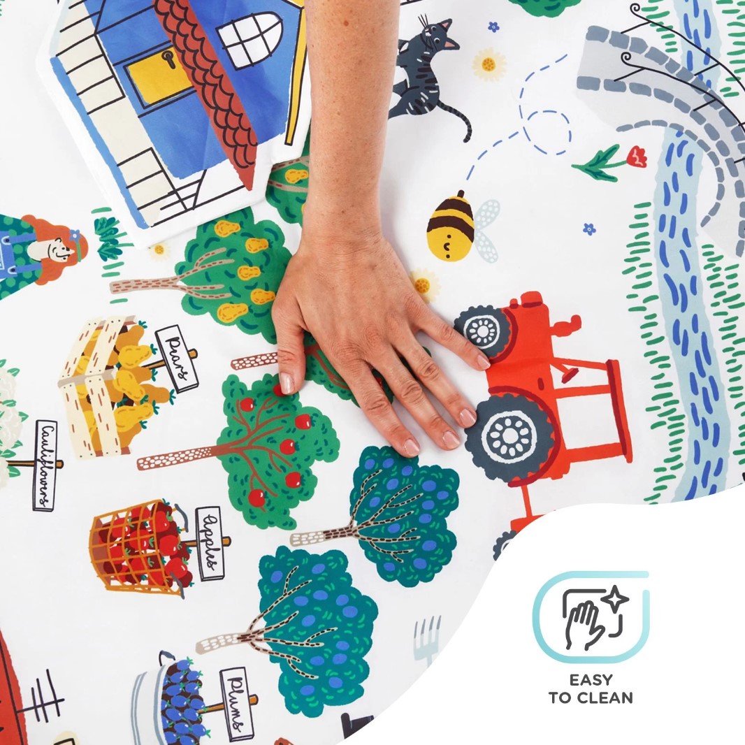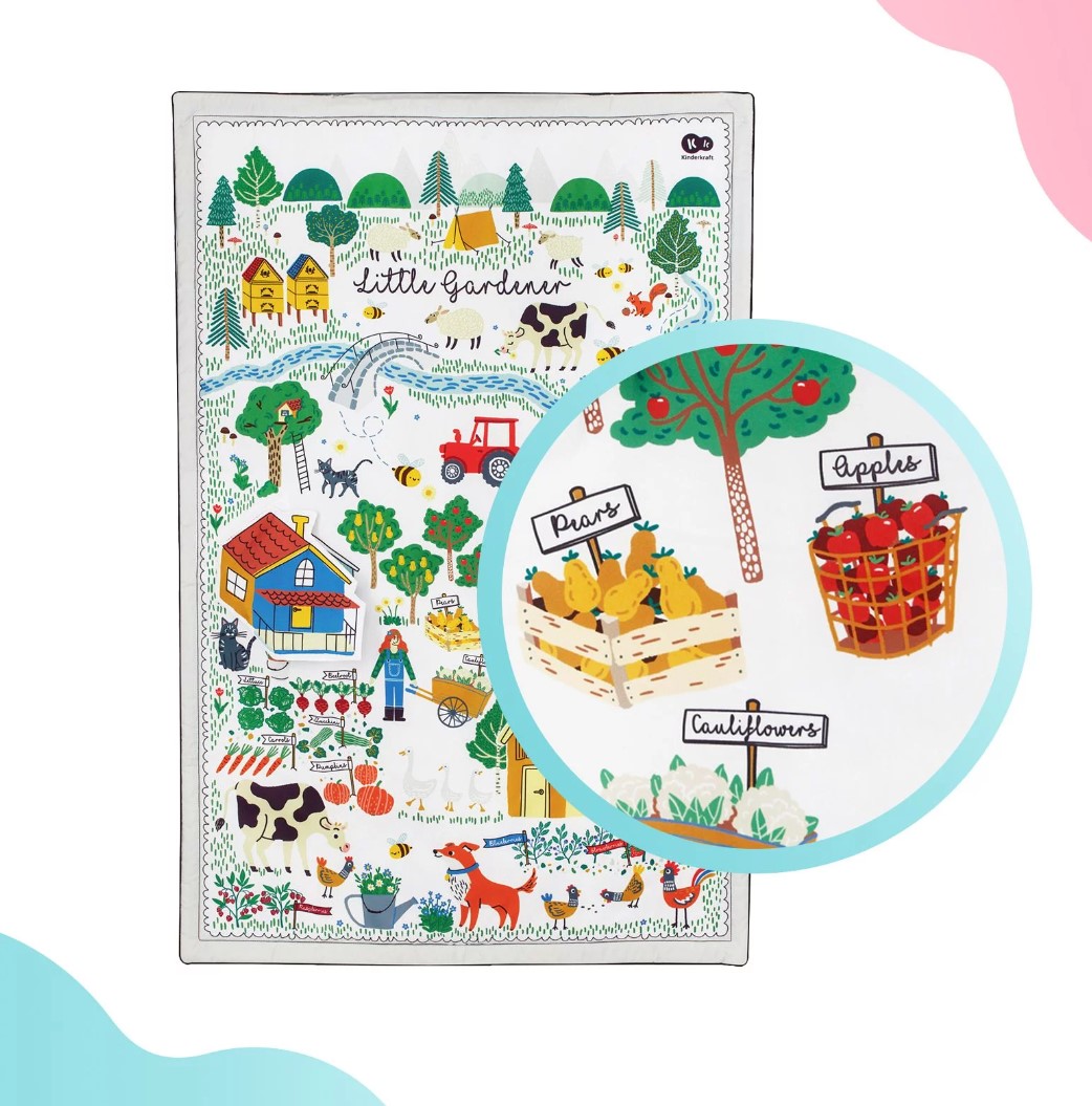 Matę LITTLE GARDENER zaprojektowano dla małych miłośników przyrody. Ma większą powierzchnię niż inne maty tego typu, co daje jeszcze większą powierzchnię do zabawy. Na macie nadrukowane są owoce i warzywa z podpisami w języku angielskim. Mata uczy podczas zabawy.