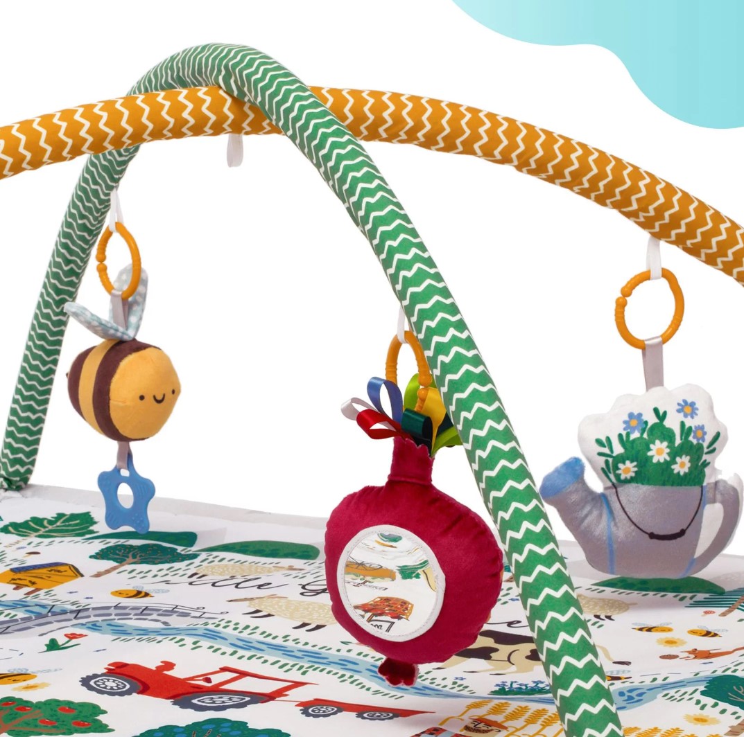W zestawie znajdują się kolorowe zabawki: pluszowy burak z lusterkiem i kolorowymi wstążkami, pluszowa konewka z grzechotką w środku, pluszowa pszczółka z gryzakiem i szeleszczącymi skrzydłami oraz pluszowy kogut.