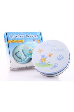 Zestaw składa się z ozdobnej puszki, w której umieszczona jest kolorowa masa gipsowa. Została ona tak przygotowana, aby było można w bardzo łatwy i szybki sposób przygotować ją do użycia, całkowicie samodzielnie. Wystarczy tylko wymieszać różową lub niebieską masę z zalecaną ilością wody, przełożyć do ozdobnej puszki, a następnie odczekać chwilę, aż zacznie tężeć. W tym momencie można już odcisnąć rączkę lub stopę Malucha oraz na spodzie wieczka wypełnić metryczkę, która zawiera miejsce na wpisanie imienia, wieku dziecka oraz datę zrobienia odcisku. Każdy z zestawów zawiera szczegółową instrukcję obsługi, dzięki czemu wykonanie masy do odcisku nie będzie stanowiło żadnego problemu. Wykonanie pamiątkowego odcisku rączki lub stopy Malucha z pewnością będzie doskonałą zabawą dla całej rodziny.