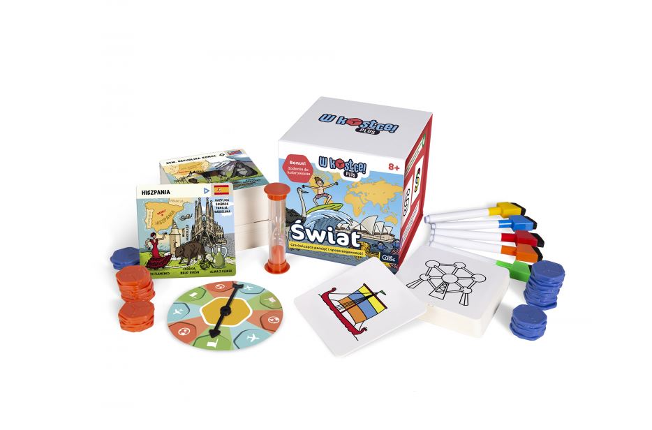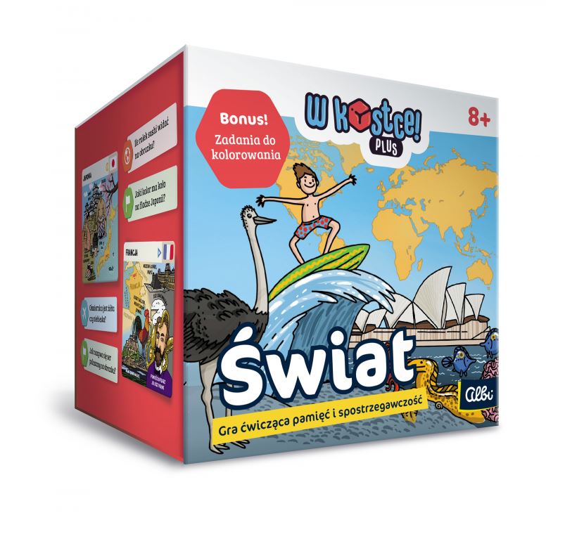 W Kostce! Plus to seria szybkich gier edukacyjnych ćwiczacych pamieć i spostrzegawczość, przeznaczonych dla dzieci od 4 roku życia. Z kostek każdy może dowiedzieć sie ciekawych faktów o świecie, a także poznać litery czy ćwiczyć umiejetności matematyczne i percepcyjne. Wszystko to w sposób przyjazny dziecku: celem jest zapamietanie jak najwiekszej liczby faktów na danej karcie tematycznej w ciagu dziesieciu sekund. Prawidłowe odpowiedzi zapewniają bonusowa rundę, ale przed wami również wyzwanie w postaci wielorazowych kart do malowania, które z pewnością sprawdzą waszą pamięć wzrokową! Gra zawiera karty z obrazkami, które musisz zapamiętać, a następnie odpowiednio pokolorować za pomocą pisaków.