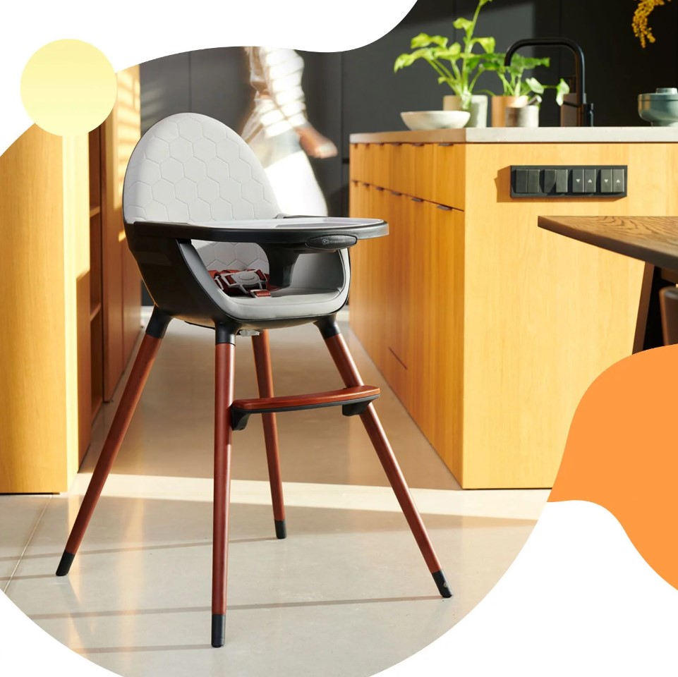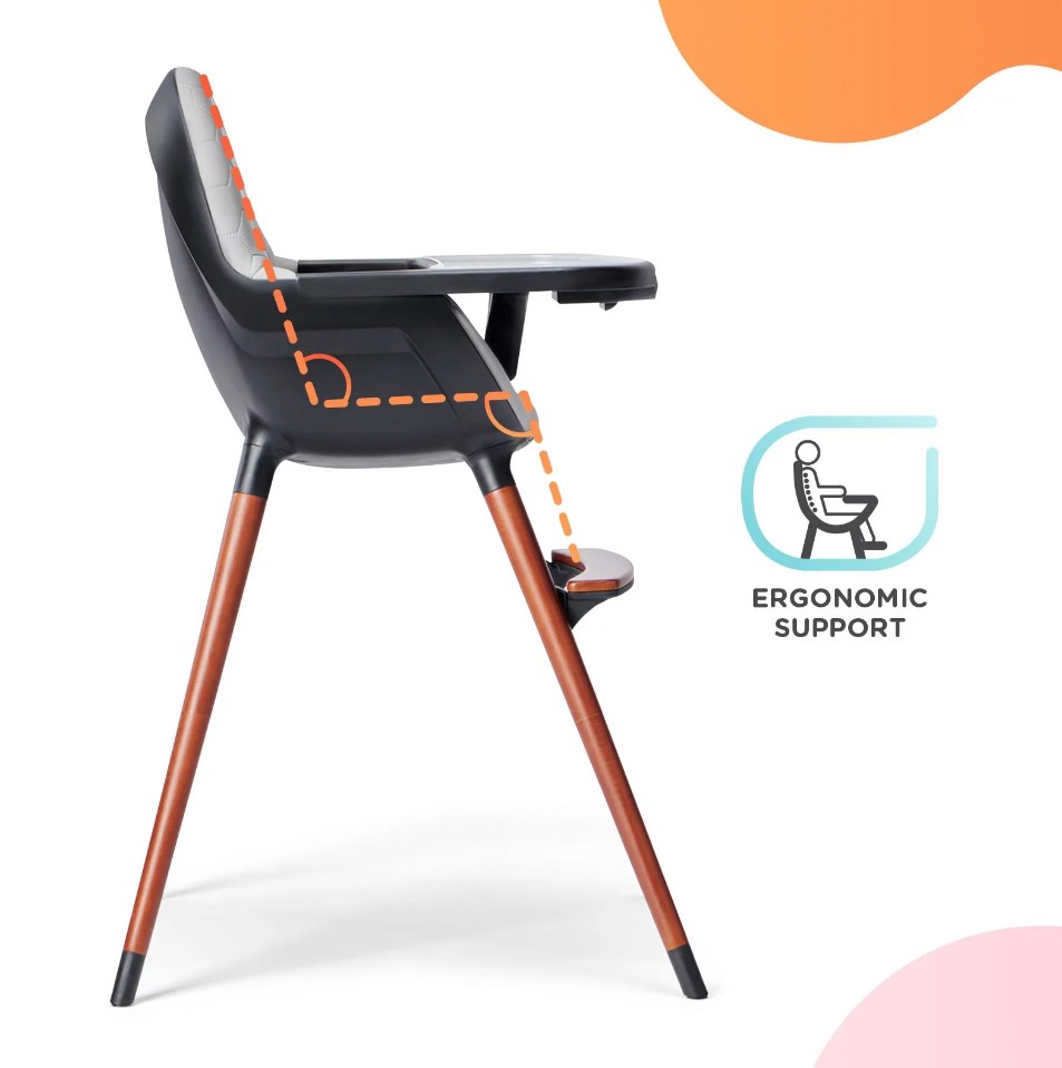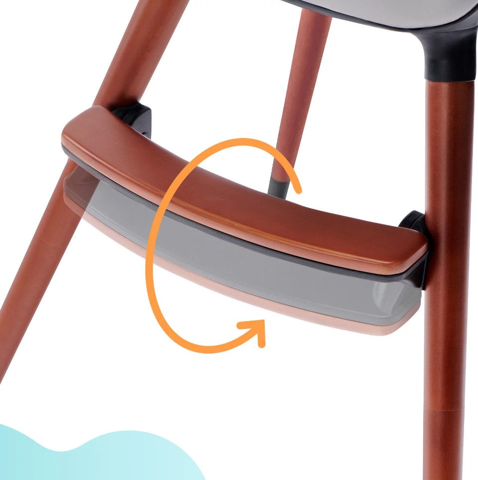 Krzesełko wyposażono w wygodny podnóżek z 2-stopniową regulacją. W kilka chwil dopasujesz jego wysokość i ustawienie do wzrostu dziecka. Dba o komfort podczas posiłku oraz jednocześnie wspiera przyjmowanie prawidłowej postawy podczas jedzenia.