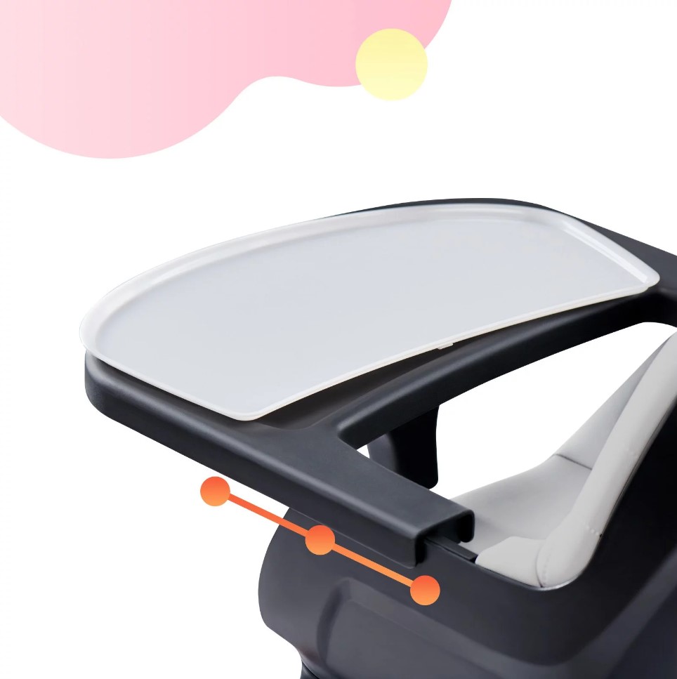 Tackę można regulować w 3 odległościach względem oparcia. Można ją też całkowicie zdemontować, gdy chcesz przekształcić FINIX w stylowy fotelik dla starszaka. Blat łatwo zdejmiesz i umyjesz pod bieżącą wodą.