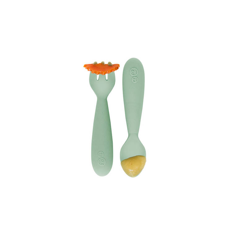 Innowacyjny zestaw zawiera łyżeczkę i widelczyk zaprojektowane przez specjalistę w dziedzinie logopedii i żywienia dzieci, dzięki czemu ich kształt został idealnie dopasowany do ust małego dziecka. Dodatkowo używanie dwóch rodzajów sztućców zwiększa świadomość sensoryczną malucha, wspiera rozwój aparatu mowy i małej motoryki – trenuje chwytanie, nabieranie (łyżka) oraz przekłuwanie (widelec). Główki obu sztućców mają optymalną wielkość, a trzy ząbki widelca są odpowiednio szerokie, dzięki czemu zestaw jest całkowicie bezpieczny dla delikatnych dziąseł maluszka. Miękki materiał chroni wyrzynające się ząbki, a lekkie wygięcie pomaga w nauce domykania warg. Odpowiednio krótkie, dość grube, zaokrąglone i antypoślizgowe uchwyty zostały wyprofilowane tak, by sztućce były łatwe do trzymania w małych rączkach. Dodatkowe wypustki pod spodem uchwytów stabilizują leżące sztućce.