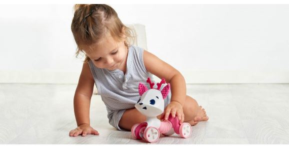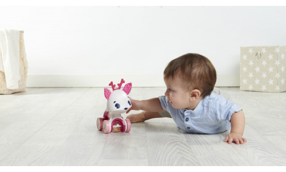 Gdy dziecko czuje się bardziej pewnie w pozycji na brzuszku, poruszająca się zabawka zachęca dziecko do rozciągania ciała i badania własnych zdolności mobilnych.