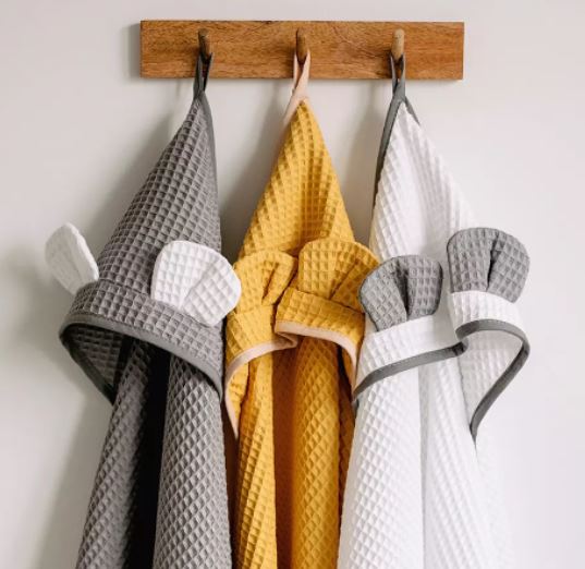Bardzo lekkie, przyjemne w dotyku okrycie po kąpieli, o wyjątkowej strukturze materiału, która przypomina wafelek. Posiada kapturek z fikuśnymi uszkami misia, dzięki czemu dziecko wygląda w tym niezwykle uroczo, a jednocześnie okrycie nie zsunie się z plecków.