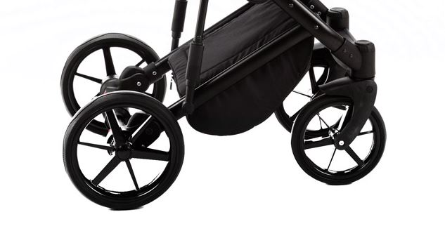 Wózek stoi na niezawodnych kołach bezdętkowych i posiada regulowane zawieszenie tylnej osi, zintegrowany hamulec i blokadę przednich kół skrętnych.