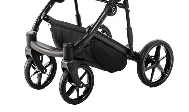 Wózek stoi na niezawodnych kołach bezdętkowych i posiada regulowane zawieszenie tylnej osi, zintegrowany hamulec i blokadę przednich kół skrętnych.