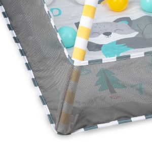 Siateczkowa barierka zabezpiecza przed tym, by dziecko opuściło samodzielnie matę. Dzięki temu wiesz, że będzie bezpieczne nawet, jeśli na chwilę odwrócisz wzrok.