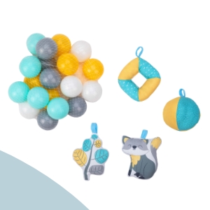 Kolorowe i różnorodne zabawki sensoryczne wspierają koordynację wzrokową, a także przyciągają uwagę ciekawskiego Maluszka. W zestawie znajdują się też miękkie, kolorowe piłeczki.
