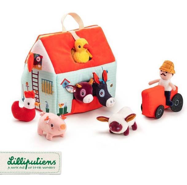 Rozkładany domek z 6 zwierzątkami, rolnikiem i traktorem z kolekcji Farma belgijskiej marki Lilliputiens to niebanalna, miękka, wieloelementowa zabawka, angażująca dziecko na wiele godzin. W skład zestawu wchodzi turkusowo - czerwony domek – farma, wąsaty rolnik Jeff, jego czerwony traktor oraz zwierzęta: krówka Rosalie, świnka Simon, owieczka Yvon, kaczor Gaston, kokoszka Paulette i osiołek Ignace. Wszystkie elementy uszyte są z materiałów o różnorodnych fakturach i wzorach. Budynek ma otwierany jeden długi bok wraz z dachem – po rozłożeniu stanowią one wiejską zagrodę z nadrukiem grządek, pastwiska, stawu czy błota dla świnki. Na drugiej długiej ścianie farmy jest otwarte okno na poddaszu i otwierane wrota do zagrody. Z boku farmy jest kurnik z ruchomymi drzwiami, a z drugiej strony są namalowane ogrodowe narzędzia i paw. Wszystkie otwierane elementy farmy maja zapięcia na rzepy, a na jej dachu znajduje się poręczny uchwyt do przenoszenia. Zabawka jest solidnie wykonana i bezpieczna. Pobudza dziecięcą wyobraźnię, zachęca do snucia opowieści, odgrywania ról i odtwarzania sytuacji, znanych z życia na wsi. Rozwija małą motorykę (chwytanie, przesuwanie, zapinanie, otwieranie), aktywizuje zmysł wzroku i dotyku, uczy gatunków zwierząt hodowlanych i rytuałów pracy na farmie.