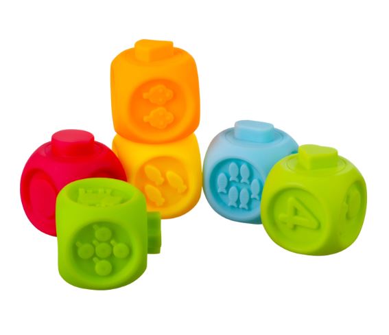 W zestawie znajduje sie 6 różnokolorowych miękkich klocków, które można ze sobą łączyć.