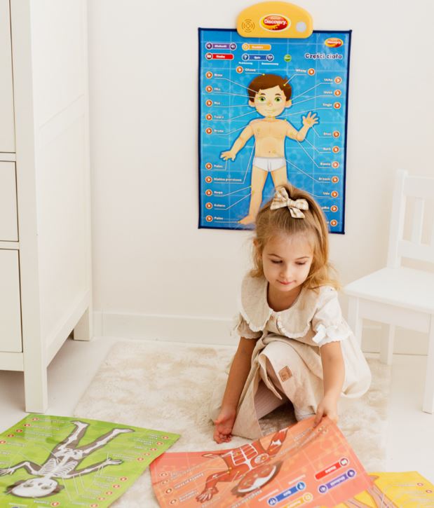 Wyrusz w fascynującą podróż w głąb człowieka! W zestawie znajdziesz aż 4 edukacyjne plakaty dla dogłębniejszego poznania ludzkiej anatomii, począwszy od ciała człowieka, przez mięśnie, narządy wewnętrzne, aż po szkielet. Na każdym z plakatów czeka na Ciebie tryb nauka, w którym poznasz informacje na temat poszczególnych elementów człowieka, i quiz w dwóch poziomach trudności (podstawowy i zaawansowany). Aby przystąpić do zabawy, należy uruchomić zabawkę, naciskając na okrągły guzik umieszczony w górnym module, wybrać interesujący nas plakat i za pomocą ukrytych magnesów przyczepić go do plakatu bazowego, a następnie nacisnąć przycisk START, widoczny na plakacie. Plakat bazowy jest także aktywny.