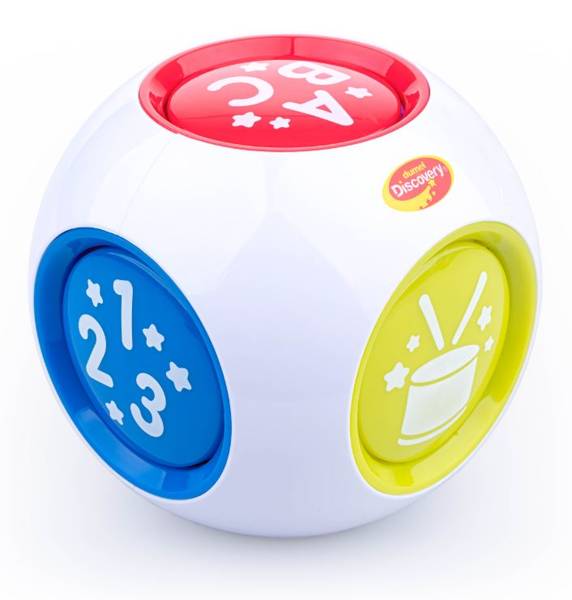 Edukacyjna, dotykowa kostka pełna dźwięków i kolorów zabawi na 6 różnych sposobów! Kryje ona w sobie dźwięki instrumentów muzycznych, odgłosy zwierząt, słowa w języku polskim: nazwy kolorów, literek i cyferek oraz wesołe melodie. Poszczególne dźwięki uruchamia się poprzez dotykanie kolorowych ścianek, na których znajdują się symbole odpowiadające trybom zabawy. Kostka posiada regulację głośności i wyłącznik dźwięku.