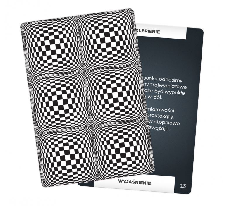 W pudełku znajdziesz 50 kart z tzw. złudzeniami optycznymi, czyli zniekształconym obrazem rzeczywistości. Z jednej strony karty znajduje się rysunek ze złudzeniem, na drugiej wyjaśniono jego efekt. Jak to możliwe, że nasz mózg interpretuje obraz inaczej, niż odbiera go nasze oko? Nietypowe podejście do złudzeń optycznych pozwoli się zatrzymać i zmienić sposób myślenia.