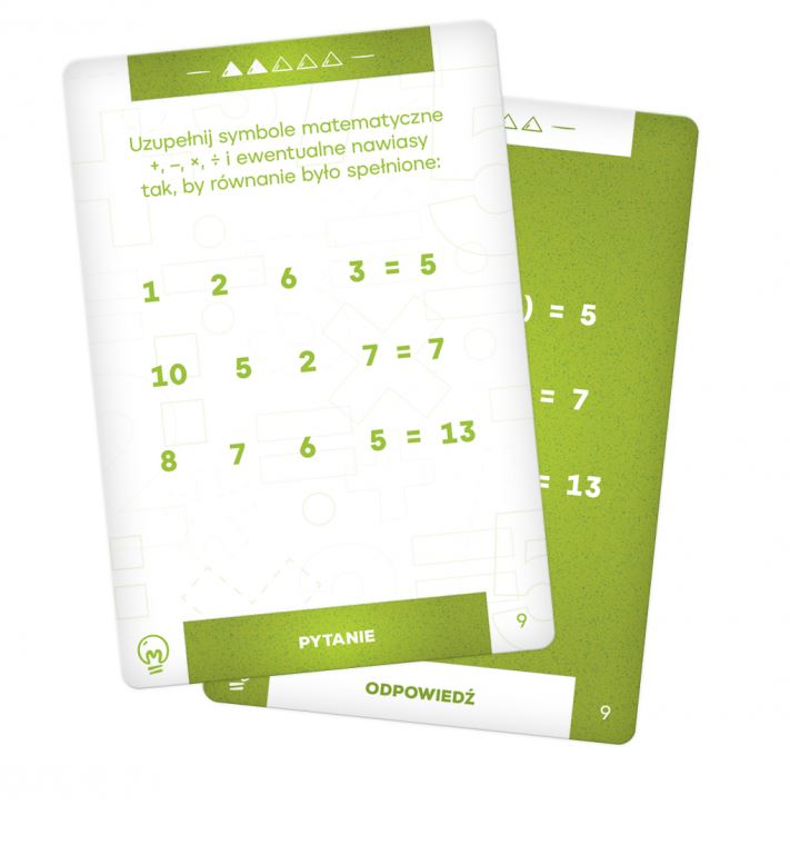 W pudełku znajdziesz 50 kart – bogaty wybór zadań matematycznych. Regularne ćwiczenie umysłu jest ważne w każdym wieku, przypomnij sobie działania matematyczne i rozgrzej zwoje mózgowe! Zadania są podzielone na pięć poziomów trudności, każdy znajdzie coś dla siebie.